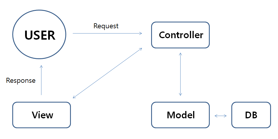 - Controller 클라이언트의 요청을 받고 데이터를 model에 의뢰하여 view에 전달, 데이터와 비즈니스 로직 사이의 상호동작을 관리한다.