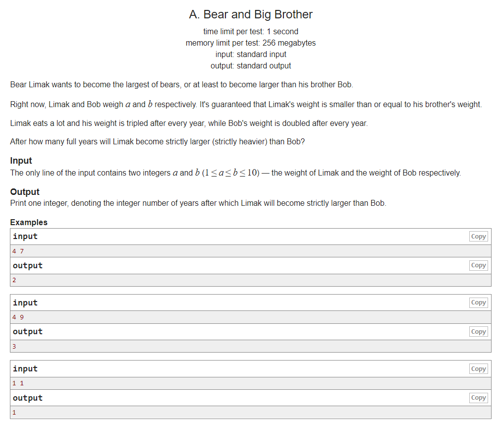 Limak은 매년 3배씩 커지고 Bob은 2배씩 커질 때 몇 년후에 Limak이 Bob보다 커지는가?