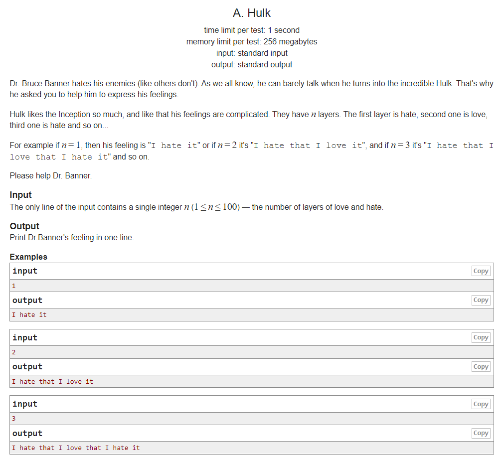 n = 1 이면 "I hate it", n = 2 이면 "I hate that I love it", n = 3 이면 "I hate that I love that I hate it"
