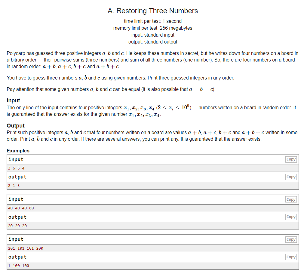 a, b, c 정수의 덧셈 조합으로 임의의 순서로 작성된 정수 4개(a+b, a+c, b+c, a+b+c)를 입력받아 a, b, c 정수를 유추하라.