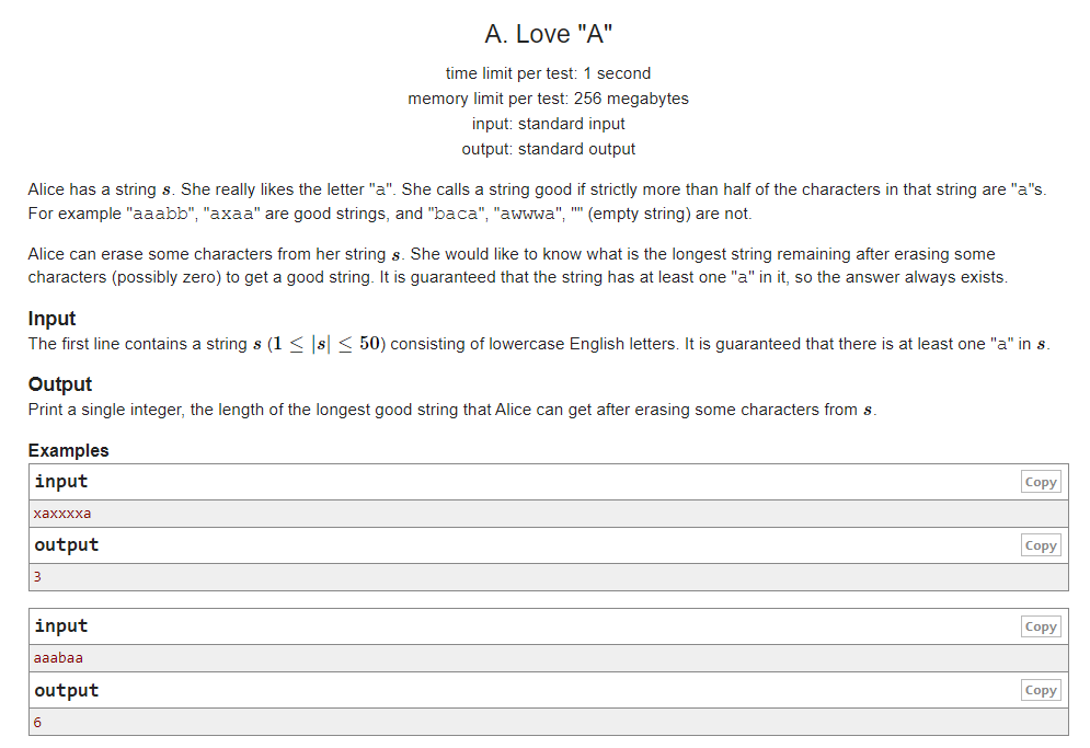 문자열에서 문자를 지울 수 있는데 절반 이상이 "a" 이면서 문자열의 길이가 최대인 수를 출력하라.