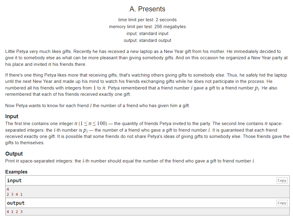 n명의 친구가 서로에게 1개씩 선물을 주고 받을 때 입력은 선물을 준 친구의 숫자이다. 누구에게 받았는지 순서대로 출력하라.