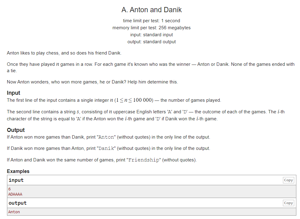 체스 하기를 좋아하는 Anton과 Danik. 두 사람이 게임을 해서 더 많이 이긴 사람의 이름을 출력하고 비겼다면 Friendship을 출력하라.