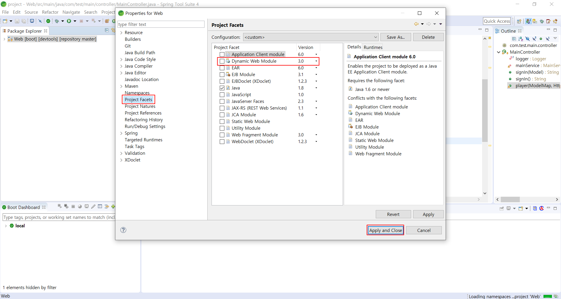 2. [Project Facets] - [Dynamic Web Module] - check - [Apply]
