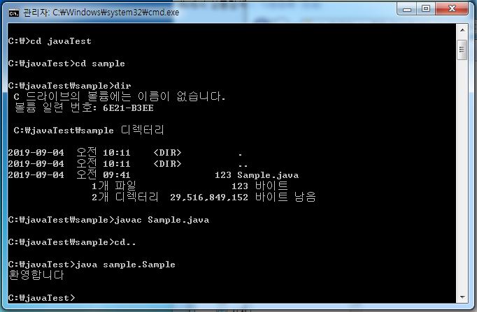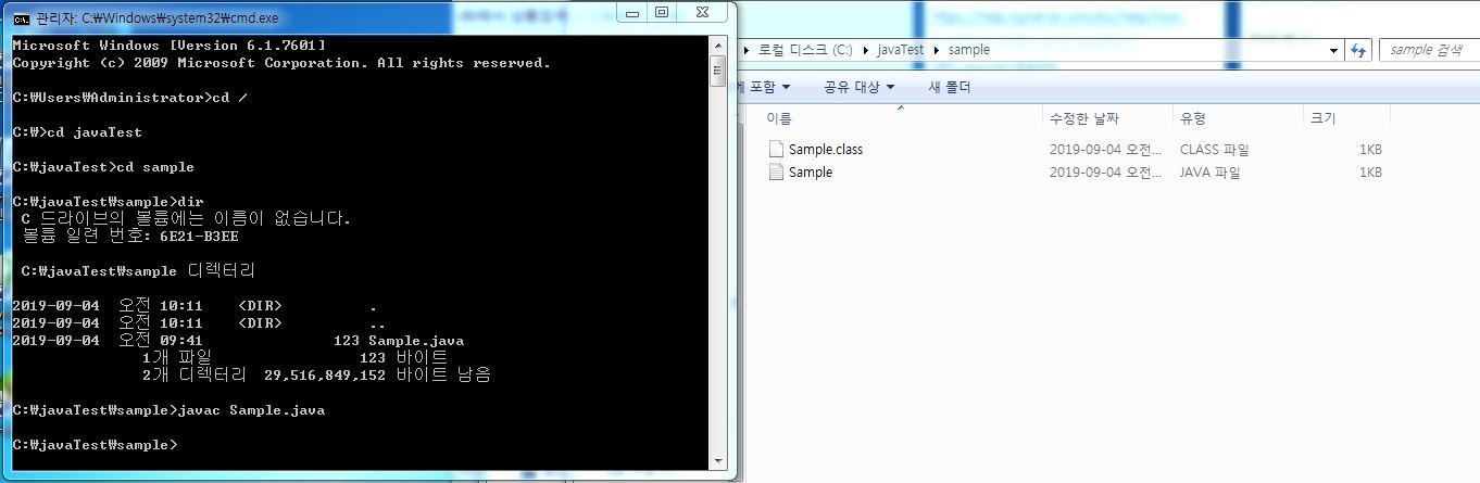 cmd창을 열고 java 파일을 저장한 경로로 들어가서 javac Sample.java 컴파일하여 class 파일 생성